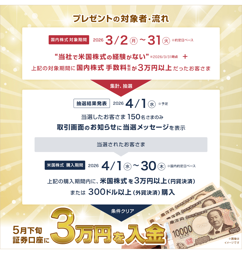 ・抽選の対象となるお客様を抽出する際、国内株式手数料(税抜)の合計額は単元未満株の売買に係る手数料は含めません。また、国内株式手数料がキャッシュバックされる別のキャンペーンやプログラムに該当する場合、当該手数料は含めません。
