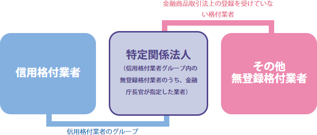 登録を受けた信用格付業者は、(1)誠実義務、(2)利益相反防止・格付プロセスの公正性確保等の業務管理体制の整備義務、(3)格付対象の証券を保有している場合の格付付与の禁止、(4)格付方針等の作成および公表・説明書類の公衆縦覧等の情報開示義務等の規制等、金融庁の監督を受けることとなりますが、特定関係法人およびその他無登録格付業者は、これらの規制・監督を受けておりません。グループ指定制度・特定関係法人について