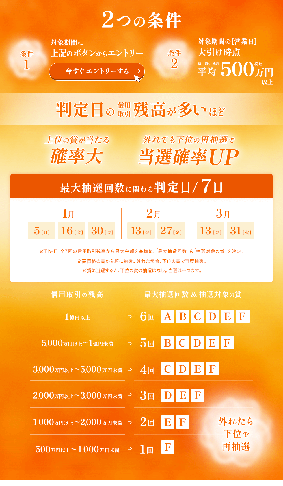 ・信用取引残高は、買建/売建・制度/一般を問わず対象です。・対象は「ネット取引」をご利用のお客さまに限られます。 「対面取引」「コール取引」の方は対象外です。・景品手配時点で以下に該当する場合、対象外となります: - 証券総合口座が閉鎖・閉鎖手続き中 - 「対面取引」「コール取引」に変更済 - 郵便物が返送されている場合・カタログギフトはご登録住所に送付いたします(2026年4月下旬頃)。 当選された方には、ログイン後のお知らせで個別にご案内します(2026年4月13日頃)。・カタログの内容は、発注先の都合により変更される場合があります。・キャンペーン内容は、予告なく変更または中止となることがあります。・キャンペーン条件を満たしているかの照会・確認のお問合せは対応いたしかねます。