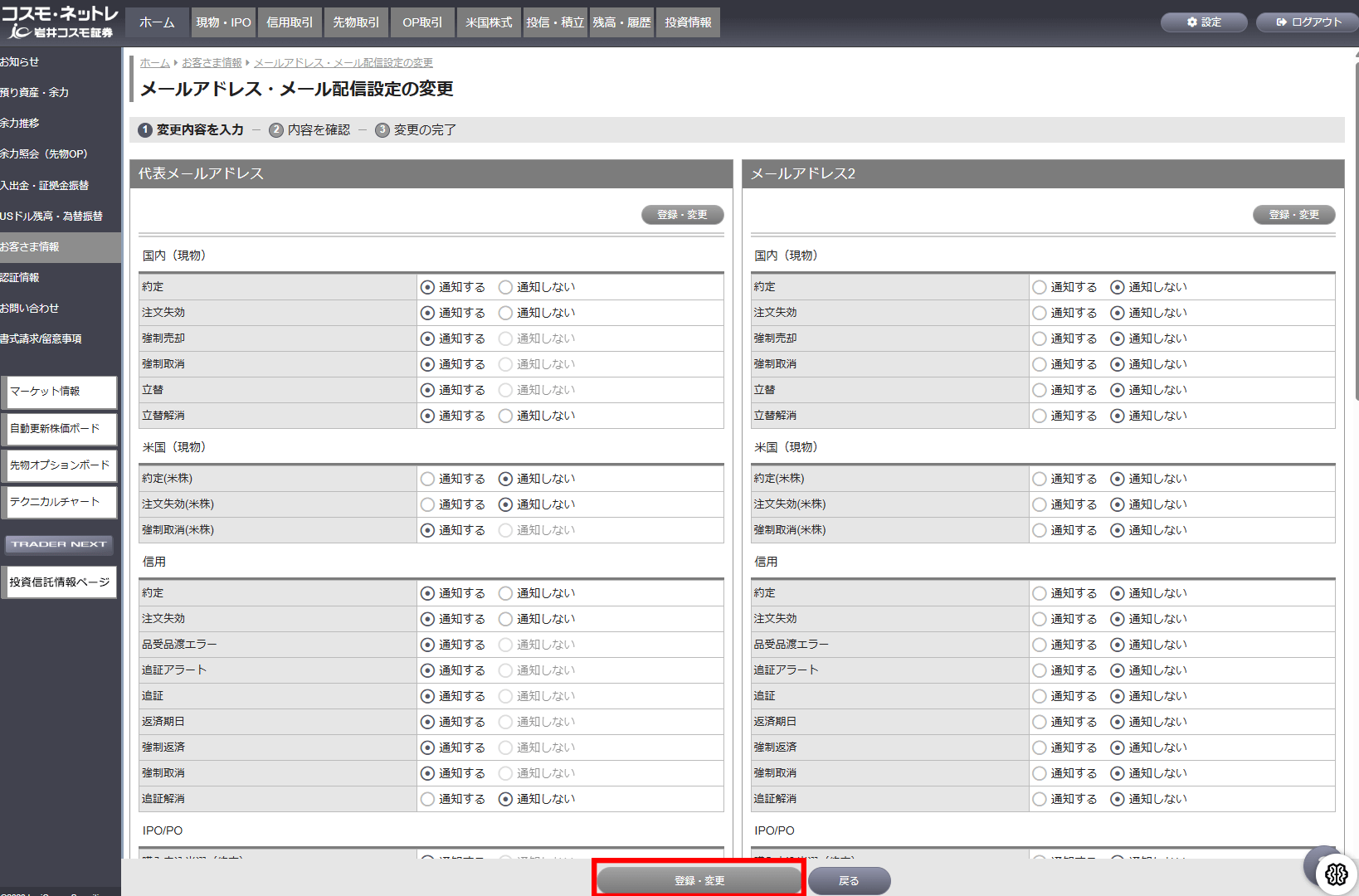 取引暗証番号を入力し、「登録・変更」ボタンを選択